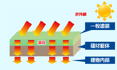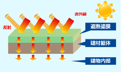 各部位に、遮熱塗装を行うと、赤外線を反射して温度 上昇を抑え、内部の温度の上昇を抑える効果があります。