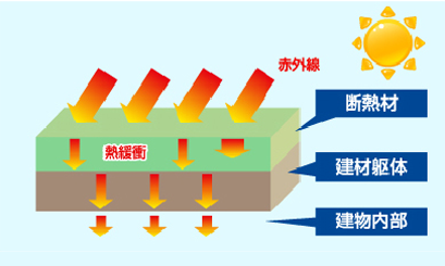 熱が建物に伝わるのを抑える為に断熱材があります。断熱 材は、外からの熱を内部に伝わりにくくし、温度の上昇を 抑えてくれます。