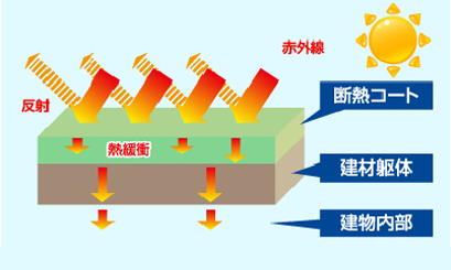断熱コートとは、断熱材・遮熱塗料の効果二つを取り入れ た塗料です。このW効果で、外部からの熱をブロックし、温度 の上昇を防いでくれます。